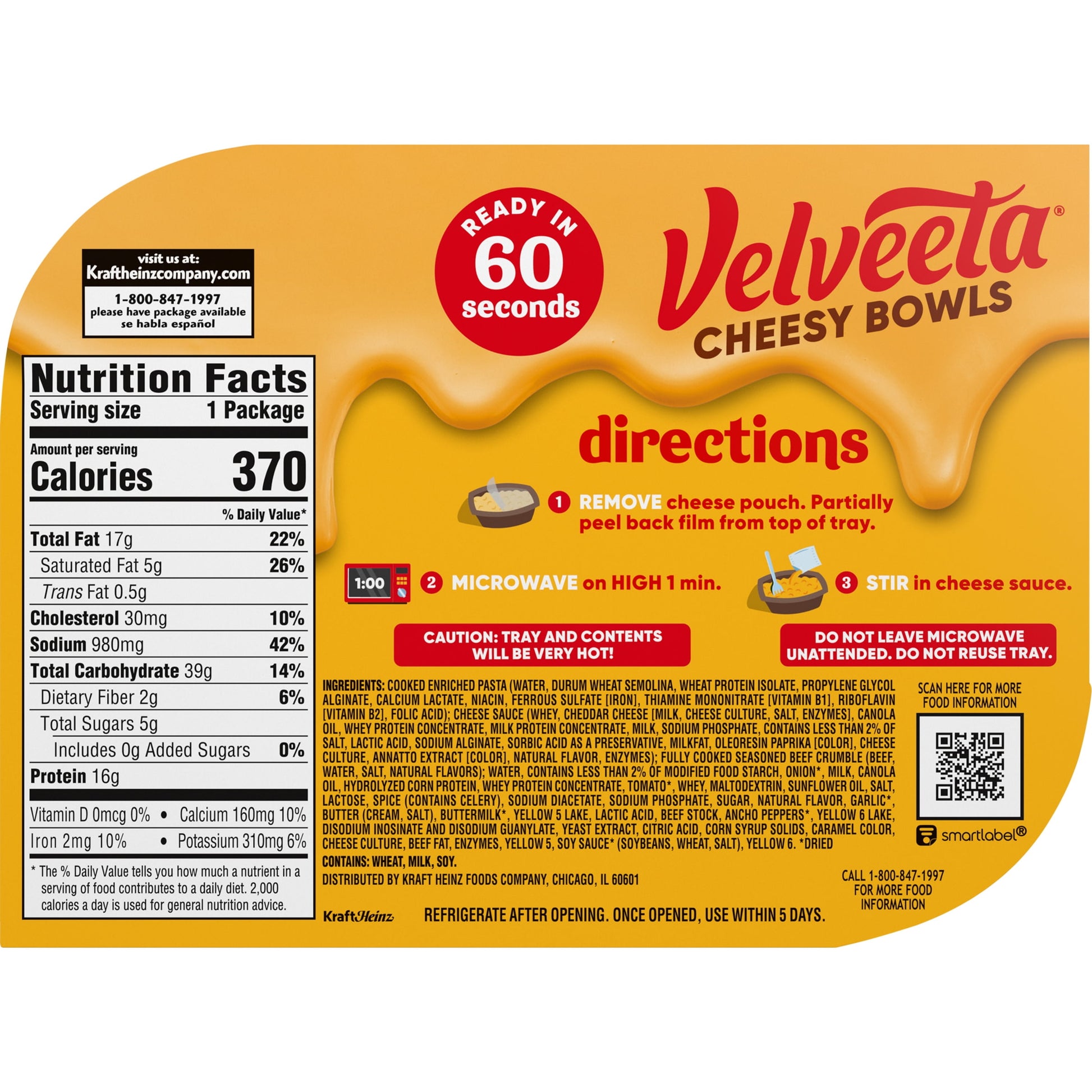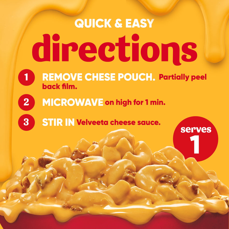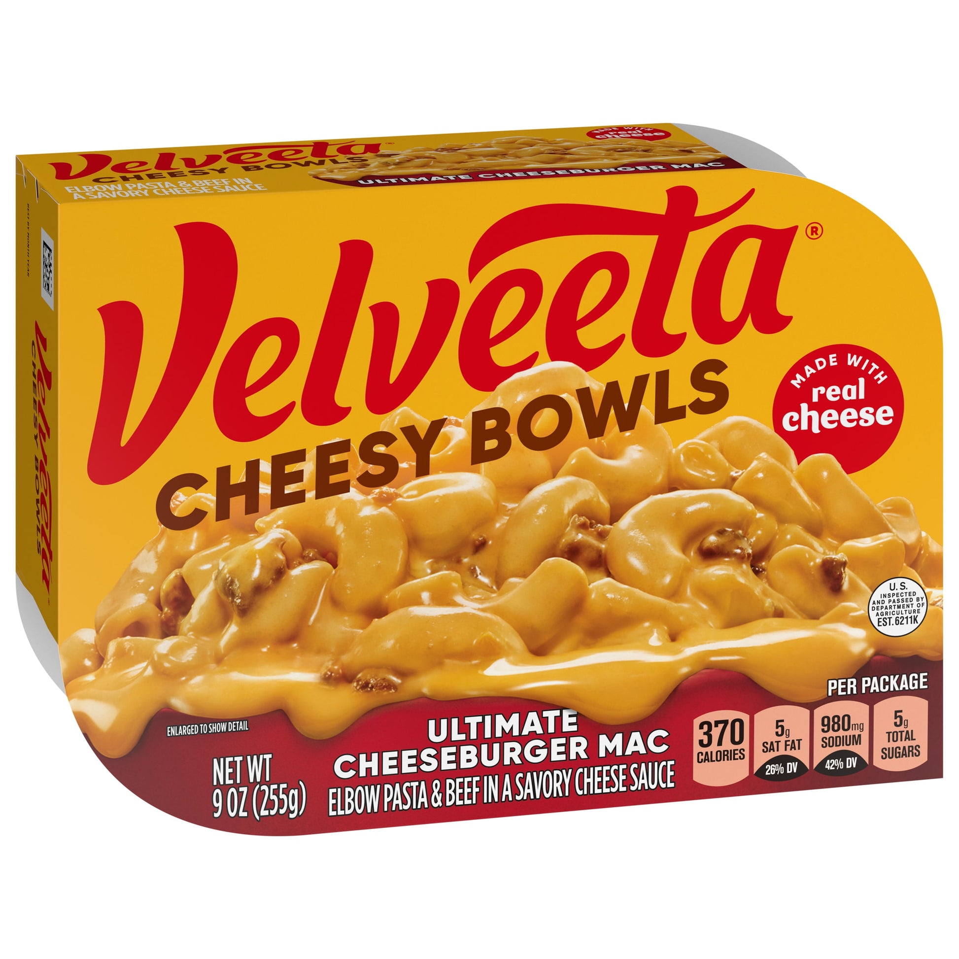 Mac and relax! Live life to the creamiest with Velveeta Cheesy Bowls Ultimate Cheeseburger Mac Microwave Meal. When your drip is as smooth as ours, you don’t waste time when it comes to delicious indulgence. For instant cheesy gratification, our cheeseburger mac and cheese hits the mark, with iconic, velvety meltability and tender elbow macaroni pasta that grips the drip like no other. With hearty seasoned ground beef, our epic macaroni and cheese dish celebrates everyday decadence. Velveeta’s supremely creamy texture and rich, savory taste satisfy your cravings any day of the week. Sometimes unnecessary is necessary, so kick back, relax and embrace the flavor. Whether it’s in the form of a snack, side dish or entree, preparing our luxuriously convenient Velveeta cheeseburger mac is a breeze. Partially peel back the tray’s top film to vent, microwave on high for 60 seconds, stir in the included packet of liquid gold cheese sauce and enjoy, unapologetically. Each single-serve bowl contains 16 grams of protein. That’s La Dolce Velveeta!