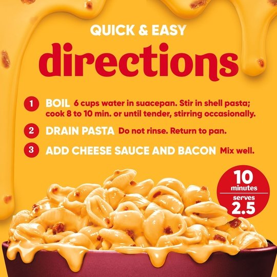A quick and easy meal that's ready in 10 minutes - simply boil the shell pasta according to the directions, drain and add the cheese sauce and bacon