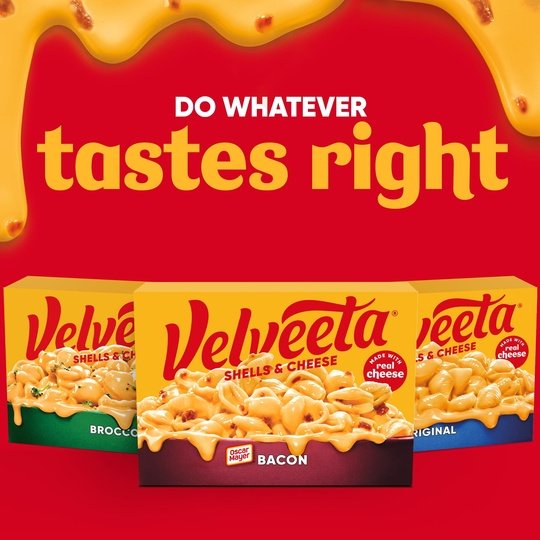 Shell yeah! Live life to the creamiest with Velveeta Shells & Cheese Pasta with Bacon. When your drip is as smooth as ours, you don’t waste time when it comes to delicious indulgence. For instant cheesy gratification, our original recipe hits the mark, with iconic, velvety meltability and tender pasta shells that grip the drip like no other. Made with bacon bits and real cheese, Velveeta’s supremely creamy texture and rich, savory taste satisfy your cravings any day of the week. Amp things up by customizing our cheesy bacon pasta with added veggies, toppings or seasonings. Sometimes unnecessary is necessary, so kick back, relax and embrace the flavor, whether it’s in the form of a snack, side dish or entree. Luxuriously convenient, preparing Velveeta Shells and Cheese with Bacon is a breeze. Simply boil the shell pasta on your stovetop according to the instructions, drain, combine with the included packet of liquid gold cheese sauce and enjoy, unapologetically. Makes approximately 2.5 servings. That’s La Dolce Velveeta!