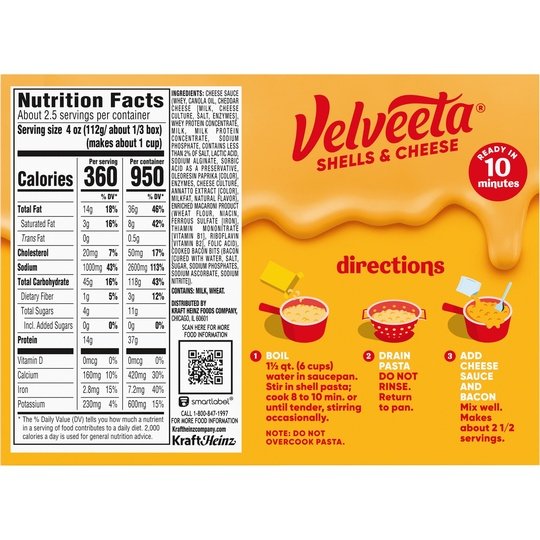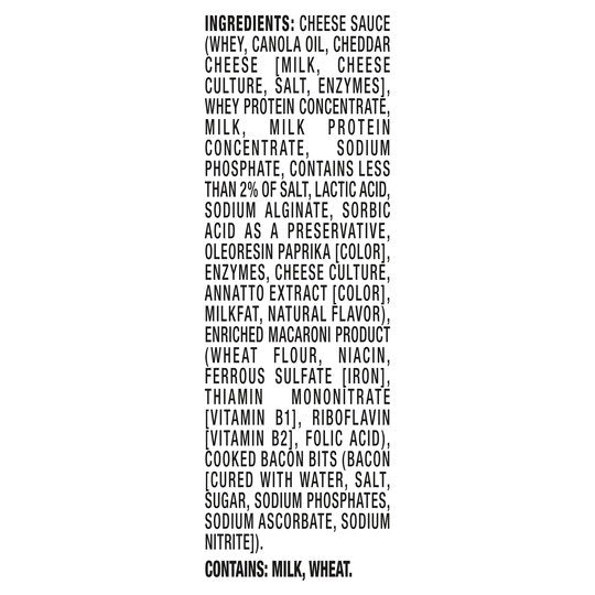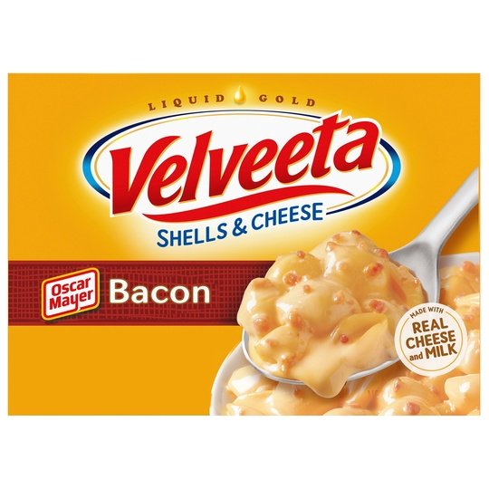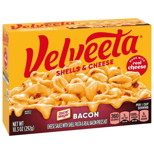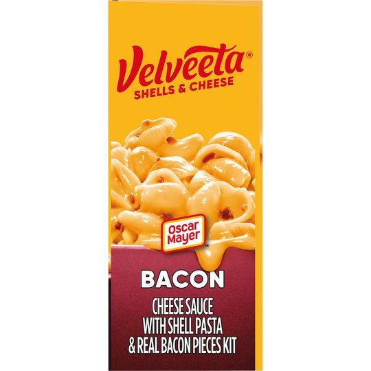 Velveeta Shells & Cheese with Bacon includes shell pasta, creamy cheese sauce and real bacon pieces