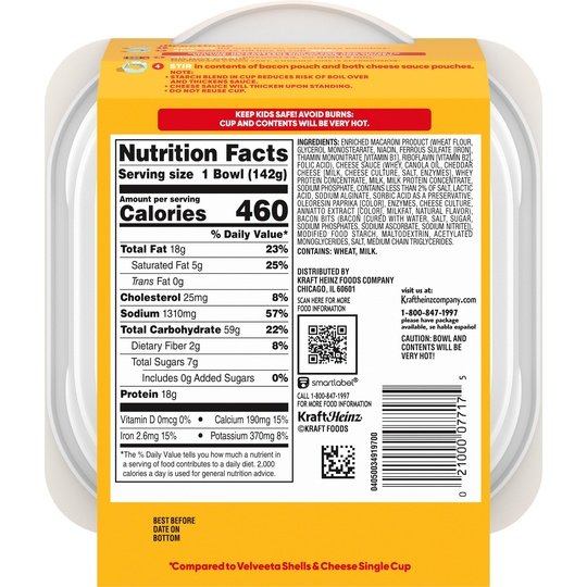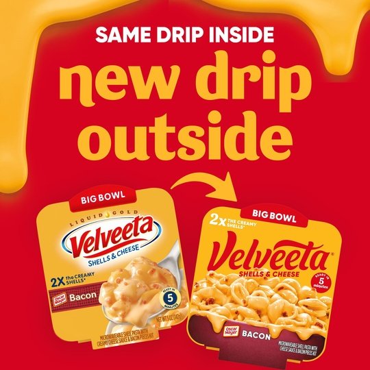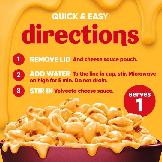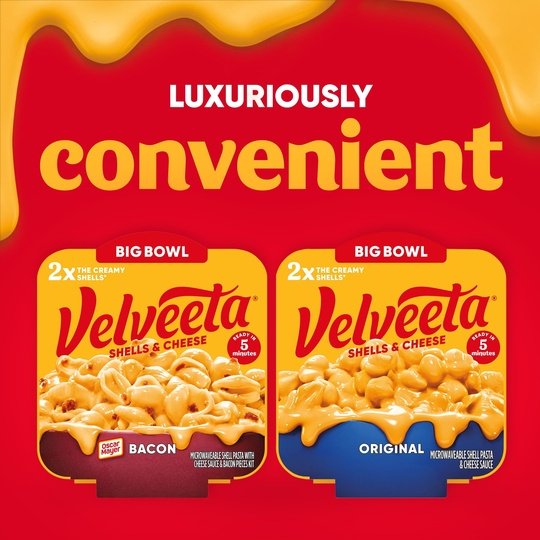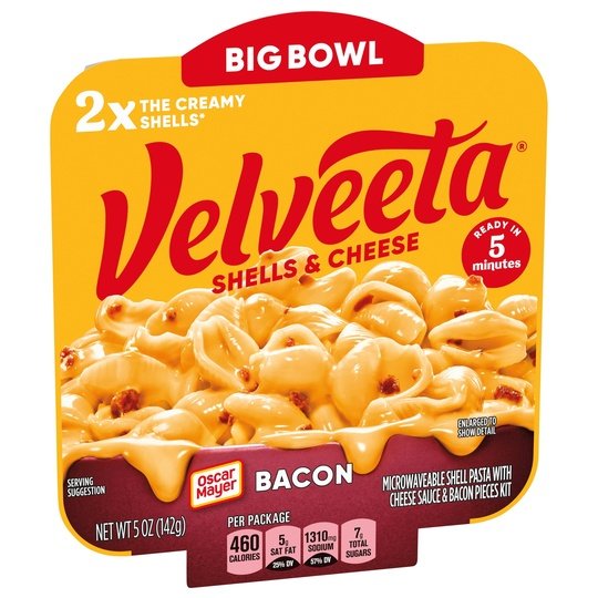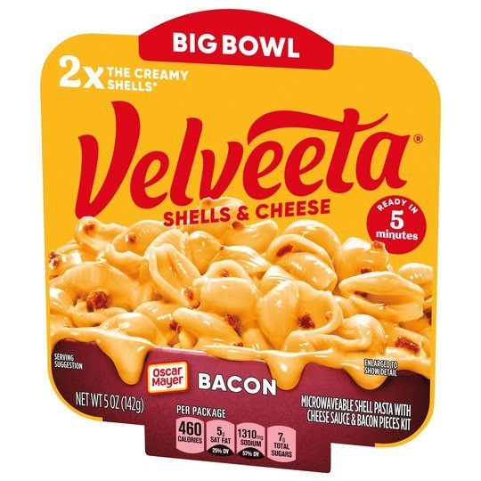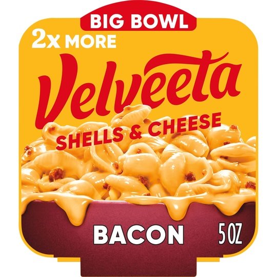 Shell yeah! Live life to the creamiest with Velveeta Shells & Cheese with Bacon and 2X the Creamy Pasta Shells Big Bowl. When your drip is as smooth as ours, you don’t waste time when it comes to delicious indulgence. For instant cheesy gratification, our original recipe hits the mark, with iconic, velvety meltability and tender pasta shells that grip the drip like no other. Made with real bacon bits, Velveeta’s supremely creamy texture and rich, savory taste satisfy your cravings any day of the week. Amp things up by customizing our cheesy bacon pasta with added veggies, toppings or seasonings. Sometimes unnecessary is necessary, so kick back, relax and embrace the flavor. Whether it’s in the form of a snack, side dish or entree, preparing our luxuriously convenient single-serve Velveeta Shells and Cheese is a breeze. Simply peel back the top, remove sauce pouch, add water up to the fill line, microwave for 5 minutes, stir in the liquid gold cheese sauce and enjoy, unapologetically. That’s La Dolce Velveeta!