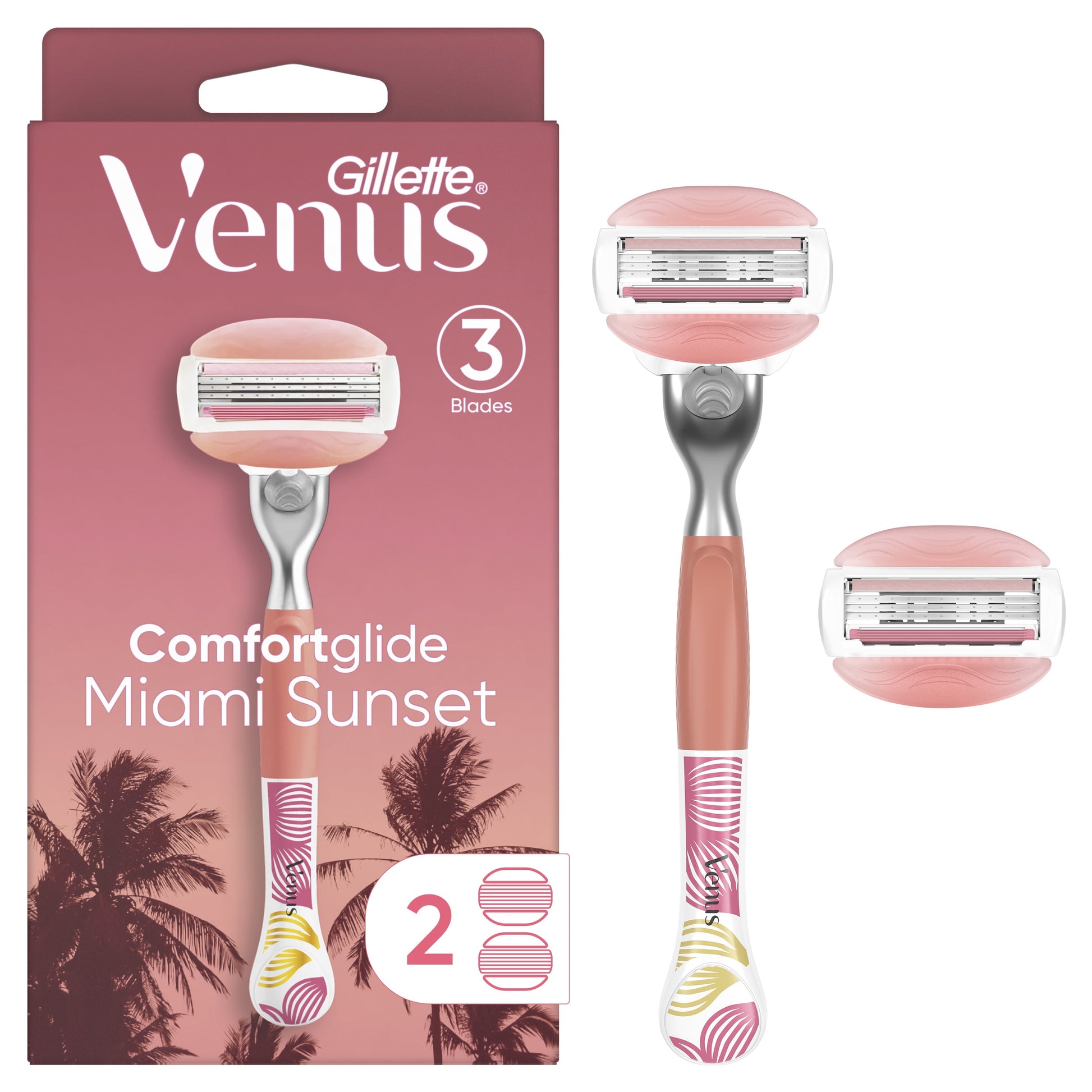 Love your skin, from sunrise to sunset. Escape to Miami with the tropical scent of hibiscus and coconut found in these Venus Miami Sunset Comfort glide razors for women. With vitamin E and kokum butter for an extra touch of Miami. Brighten up your bathroom with the vibrant, sunset-inspired design of this ergonomic Venus razor handle. Venus Miami Sunset razors feature 3 blades for a close and clean shave with built-in moisture bars that hug the blades. When wet, these moisture bars release a protective glide that helps shield your skin from nicks, cuts, and shaving irritations*. Each of the Venus Miami Sunset razor refills lasts for up to one month of shaving** and keeping the handle for 5 years vs 1 year equals 80% less waste. Concerned your Gillette Venus Comfort glide razor refill won't fit your Venus razor handle? All Gillette Venus razor refills are compatible with any Venus razor handle, except for Simply Venus and Venus for Pubic Hair and Skin razor.(*US Consumer Study, Feb 2018)(**based on twice/week shave)