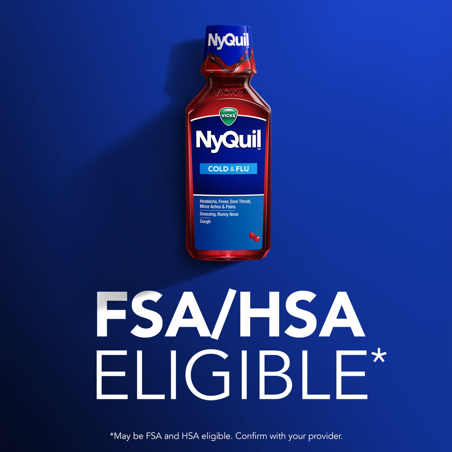 From the world's #1 selling OTC cough and cold brand, Vicks NyQuil Cold & Flu Liquid provides fast, powerful relief for your worst cold and flu symptoms. Get the NyQuil you trust in a great-tasting Cherry flavor. When cold symptoms keep you up, turn to Vicks NyQuil Cold & Flu nighttime relief over-the-counter medicine to help you get the rest you need. When you need fast relief, this powerful, multi-symptom relief medicine treats headache, fever, sore throat, minor aches and pains, sneezing, runny nose, and cough due to minor throat and bronchial irritation. Nothing works faster. Vicks has been trusted for over 125 years to relieve your cold and flu symptoms. Vicks NyQuil is the #1 pharmacist recommended nighttime cough, cold & flu brand*Active ingredients per 30 mL dose for adults are acetaminophen 650 mg (pain reliever/fever reducer), dextromethorphan HBr 30 mg (cough suppressant), and doxylamine succinate 12.5 mg (antihistamine). Store at room temperature; do not refrigerate. Take only as directed. Use only the dose cup provided. Do not exceed 4 doses per 24 hours. Adults and children 12 years and over take 30 mL every 6 hours.*2022 Pharmacy Times Survey of Pharmacists OTC Recommendations Nicholas Hall's global CHC sales database, DB21