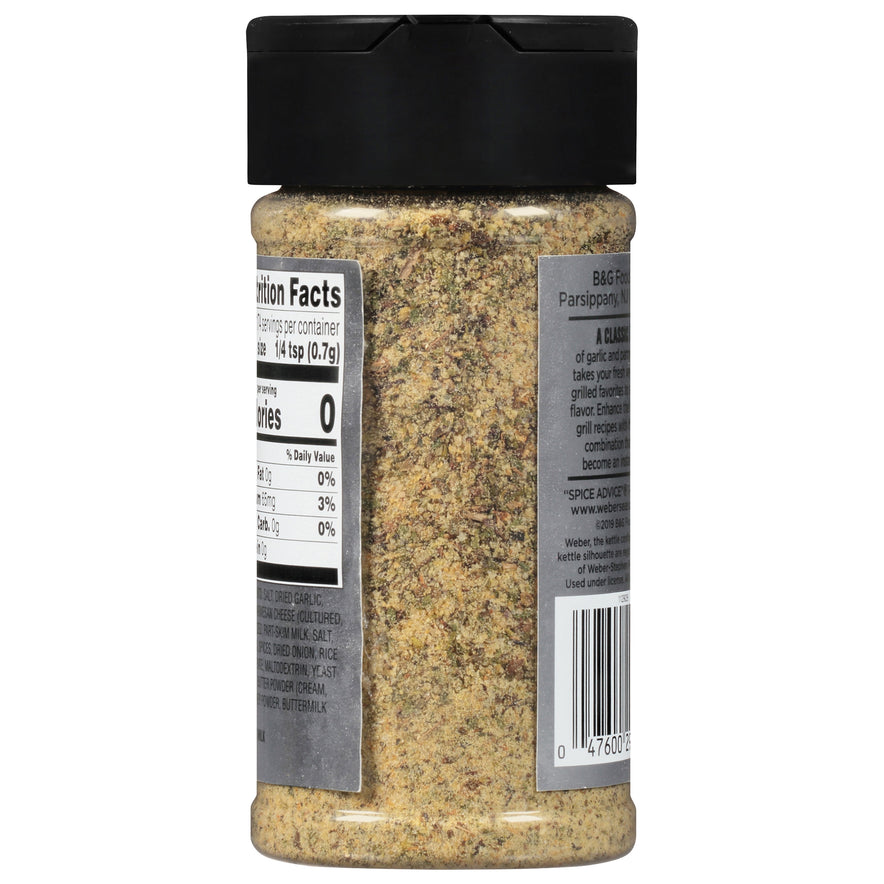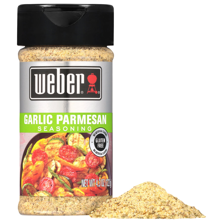 Weber Garlic Parmesan Seasoning takes your fresh vegetables and grilled favorites to a new level of flavor. This delicious grill seasoning enhances the taste of your grilled recipes by adding a savory touch that is sure to become an instant favorite. This seasoning combines garlic and parmesan cheese with salt, spice, sugar, dried onion and butter to make your meals taste even better. Weber Garlic Parmesan seasoning blend is gluten free and kosher. Add this seasoning to vegetables, pork or poultry before grilling. You can even try this on your favorite pasta dish. This product contains milk.