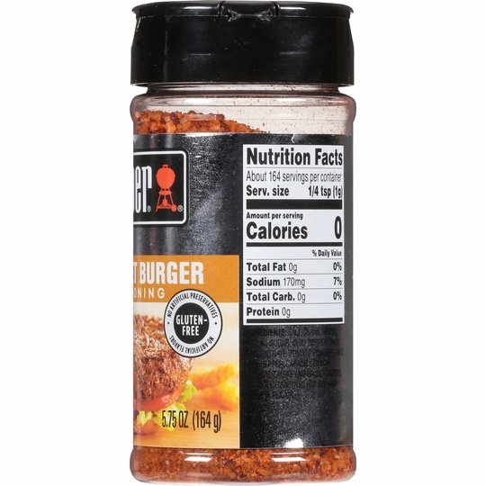 Weber Gourmet Burger Seasoning adds delicious flavor for outstanding grilled burgers. This burger seasoning blend includes sweet, savory and spicy ingredients that add depth to a grilling staple. This Weber seasoning contains an expertly blended mix of garlic, onion, salt, spices, chili pepper and more for delicious burgers any time. Weber Gourmet Burger Seasoning is kosher, gluten free and contains no MSG, artificial flavors or artificial preservatives. Add this grill seasoning on your burger before grilling, or mix into the ground meat and form into patties. Flavor that Stands Up to the Fire.