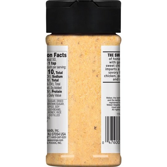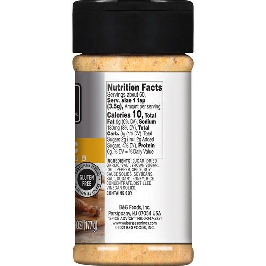 Donât let the honey and brown sugar fool you â this Weber Honey Garlic Seasoning and Rub, 6.25 oz rubâs sweetness is perfectly balanced. Garlic, salt and sweet chili peppers round out this expertly crafted, mellow and mouthwatering savory rub thatâs ideal for pork or chicken. This seasoning is the perfect combo of flavor and heat to get the party started. This gluten free seasoning mix contains no artificial flavors or artificial colors. Store in a cool, dry area of your pantry or cabinet for later use.