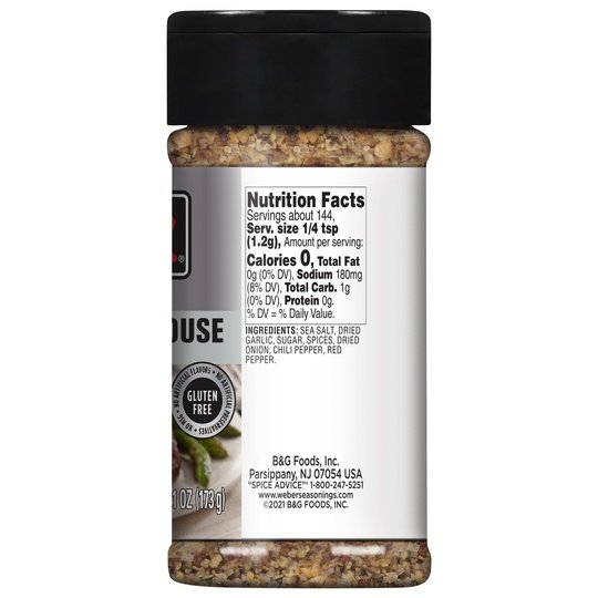 Weber Savory Steakhouse Seasoning is a classic steakhouse style blend ideal to perfectly complement a tender, delicious cut of steak. Treat yourself to a coarse medley of sea salt, garlic, crushed pepper and rosemary. This Weber steak seasoning is kosher, gluten free, has no artificial preservatives or flavors, and no added MSG. This Weber seasoning blend contains premium spices blended together to create delicious seasonings that enhance the taste of your grilled cut of steak.