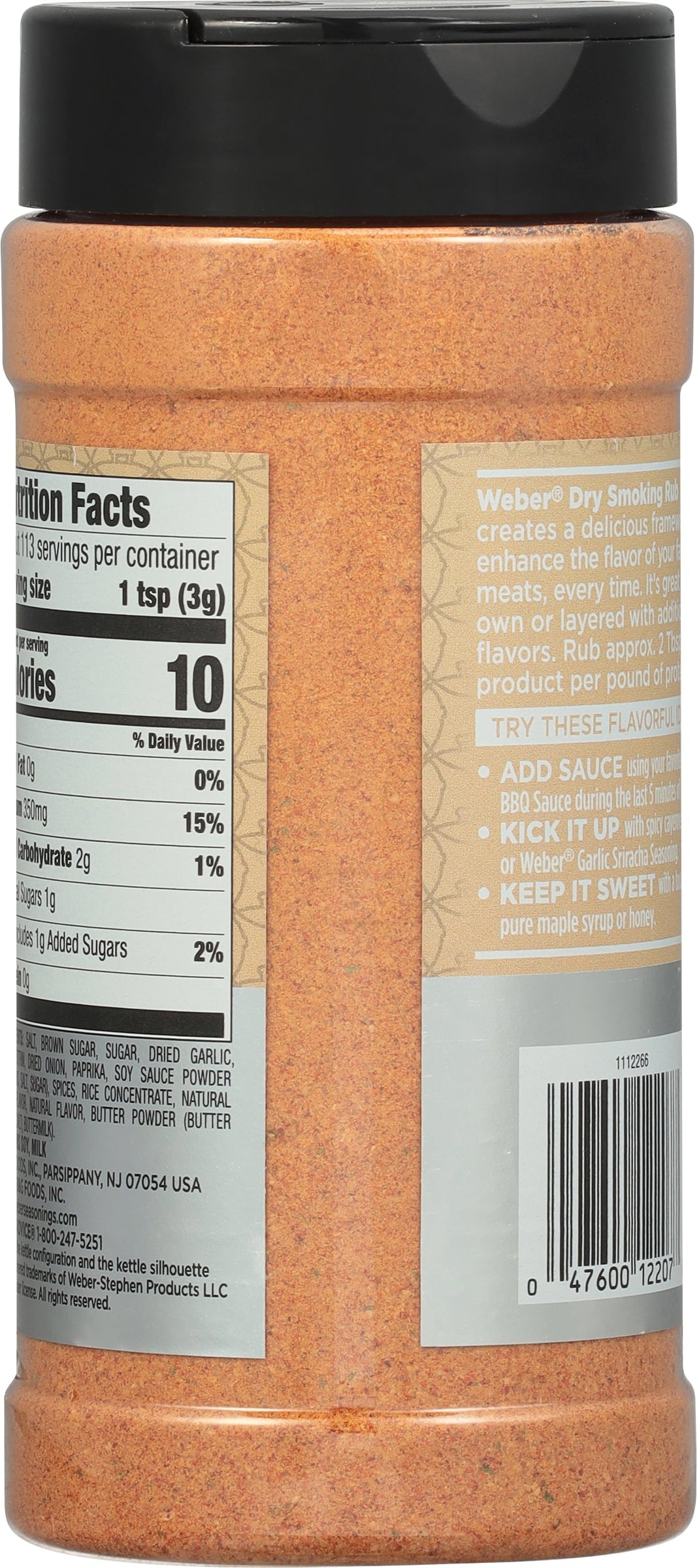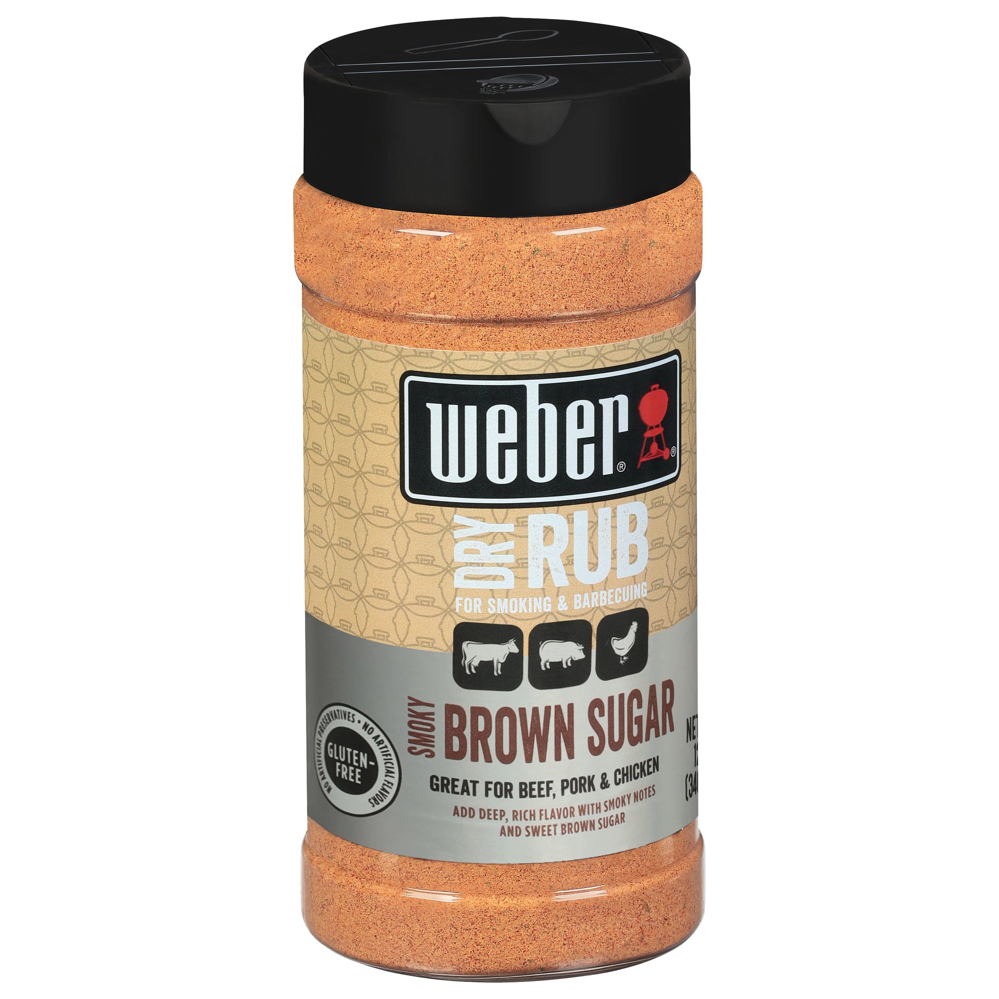 Weber Smoky Brown Sugar Dry Rub 12 ounce creates a delicious framework to enhance the flavor of your favorite meats, every time. It's great on its own or layered with additional flavors. This Weber dry smoking rub creates a rich framework to enhance the flavor of favorite dishes. Rub approx. 2 tbsp of product per pound of protein. Great for beef, pork & chicken. Add deep, rich flavor with smoky notes and sweet brown sugar. No artificial preservatives. This product contains milk and soy.