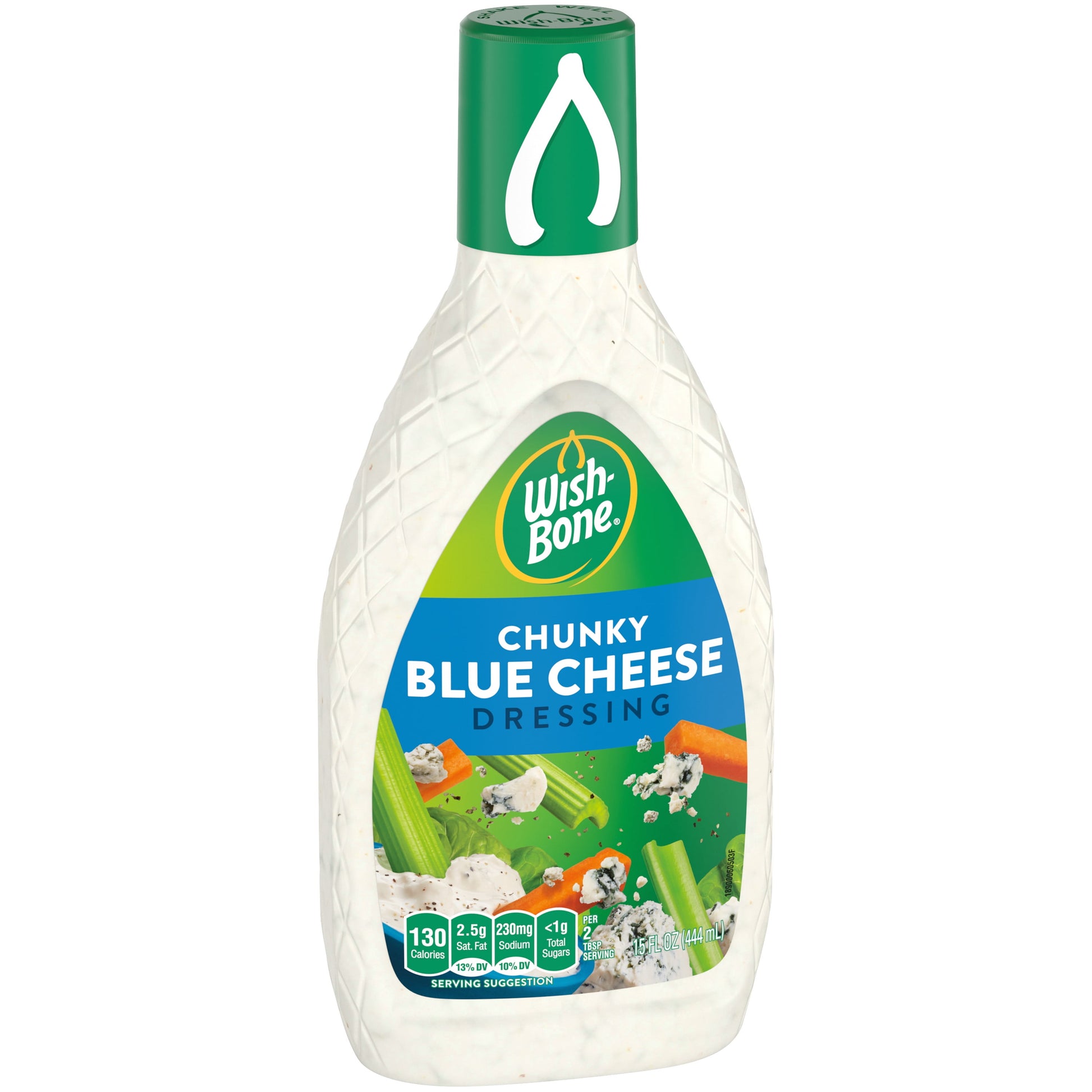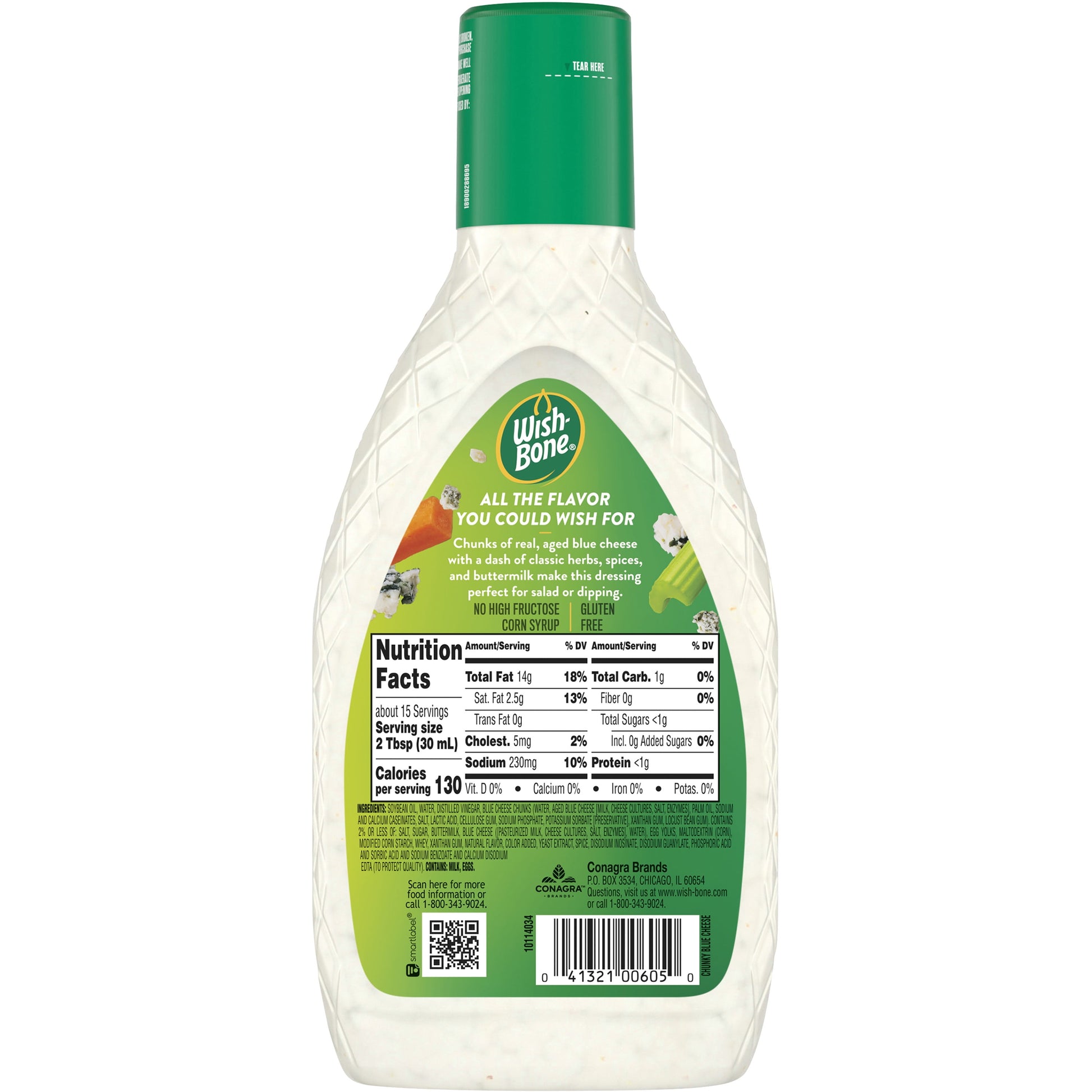 Wish-Bone Chunky Blue Cheese Dressing adds bold flavor to your favorite recipes. Chunks of real, aged blue cheese with a dash of classic herbs, spices and buttermilk make this blue cheese salad dressing irresistible. This thick and creamy salad dressing delivers great texture and flavor to all your dishes. Not only is this creamy blue cheese salad dressing made without high fructose corn syrup, but it is also gluten free. Pour this dressing over fresh salads, toss it in with vegetables or serve it as a dip. A 15 fluid ounce squeeze salad dressing bottle makes it easy to dispense the perfect amount. Refrigerate the dressing after opening. From chunky blue cheese to robust Italian dressings, Wish-Bone has what you need to make your dishes amazing.