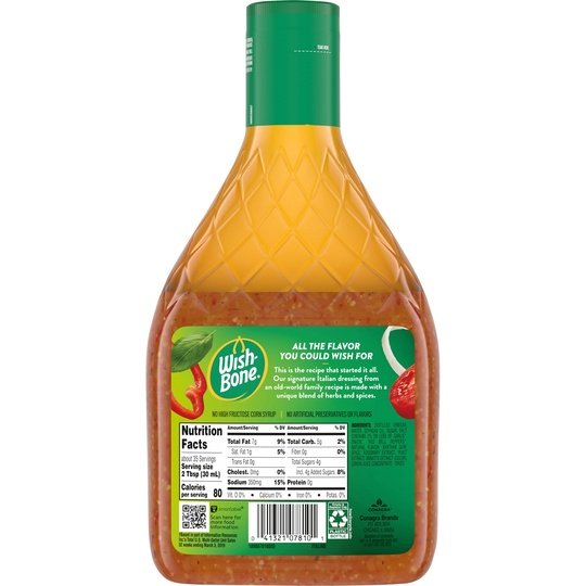 Wish-Bone Italian Dressing adds bold flavor to your favorite dishes. Made with a unique blend of herbs and spices, this Italian dressing adds a flourish of old-world flavor to marinades, pasta salads and more. Wish-Bone Italian Dressing mixes into your salads easily, providing robust flavor in every bite. Not only is this Italian dressing for salad made without high fructose corn syrup, but it also contains no artificial preservatives or flavors. This Italian salad dressing complements a variety of fresh salads, adds flavor to a chicken marinade, and is tasty with beef or a side of vegetables. The 36 fluid ounce squeeze salad dressing bottle makes it easy to dispense the perfect amount. Refrigerate the dressing after opening. From robust Italian dressing to light vinaigrettes, Wish-Bone has what you need to make your dishes amazing.