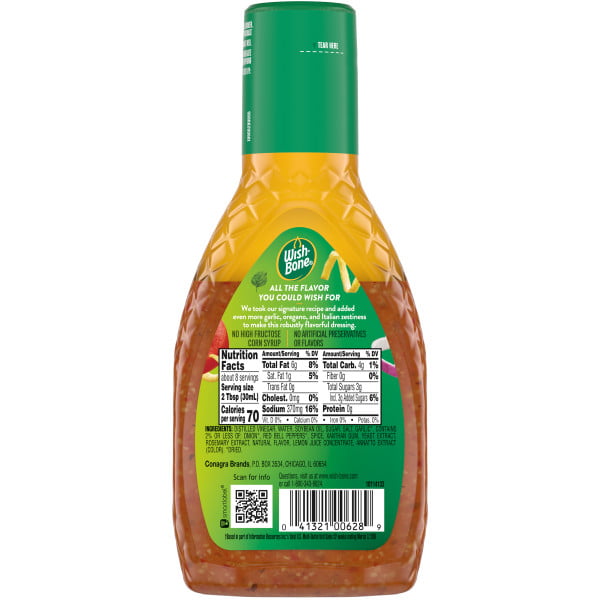 Wish-Bone Zesty Robusto Italian Dressing adds bold flavor to your favorite dishes. Made with the signature Wish-Bone recipe, garlic and oregano, this Italian dressing adds an extra zesty flourish of bold flavor to marinades, pasta salads and more. Wish-Bone Zesty Robusto Italian Dressing mixes into your salads easily, providing robust flavor in every bite. Not only is this zesty Italian dressing made without high fructose corn syrup, but it also contains no artificial preservatives or flavors. This zesty Italian salad dressing complements a variety of fresh salads, adds flavor to a chicken marinade, and is tasty with beef or a side of vegetables. The 8 fluid ounce squeeze salad dressing bottle makes it easy to dispense the perfect amount. Refrigerate the dressing after opening. From robust Italian dressing to light vinaigrettes, Wish-Bone has what you need to make your dishes amazing.