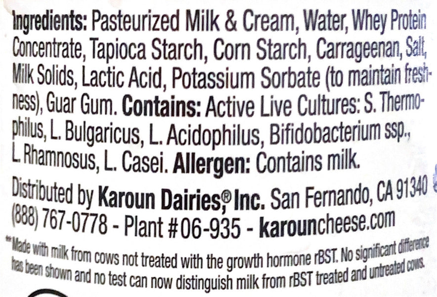 All natural. rBST free (Made with milk from cows not treated with the growth hormone rBST. No significant difference has been shown and no test can distinguish milk from rBST treated and untreated cows.). Live probiotic cultures. Karoun's old country style Yogurt Drink is a delicious and refreshing beverage that is made with real yogurt cultures. It's perfect at breakfast time, lunch or dinner, as a quick snack, or just to quench a thirst. www.karouncheese.com.