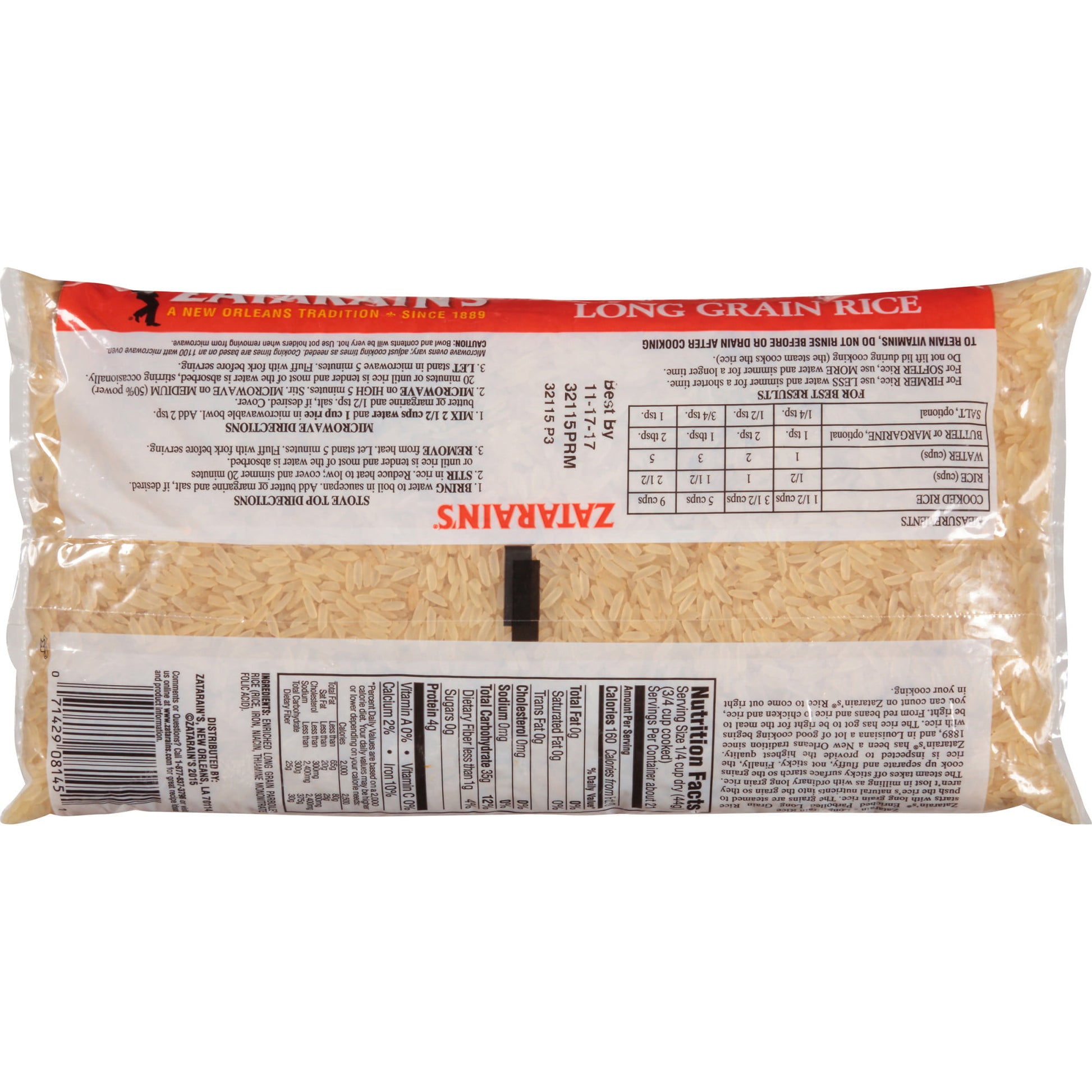 Zatarain's brings the authentic flavor of New Orleans to your kitchen – use in your favorite red beans, jambalaya or pilaf. Our steaming process results in parboiled rice that always cooks up separate and fluffy, and ready in less than 30 minutes. Zatarain's Enriched Parboiled Long Grain Rice makes it easy to create traditional Creole or Cajun meals like gumbo and dirty rice from scratch. It’s also a perfect side to weeknight dinners or added to everything from chicken soup and chicken & rice casserole to burritos, sushi and stir-fries. Zatarain’s Rice delivers quick, delicious fluffy white rice with extra-long grains to ensure that it’s never sticky. This Zatarain's® Enriched Parboiled Long Grain Rice is in a Plastic bag that is 2 pounds. Store this shelf-stable item at an ambient temperature.
